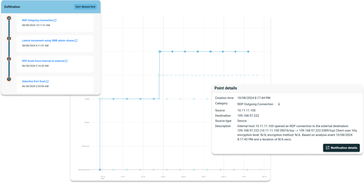 From reconnaissance to exfiltration and impact, Chain of Events puts order to chaos. By looking across the notifications generated by Muninn’s AI Detect and matching them against attack patterns, it increases the confidence that actual malicious behavior is taking place.