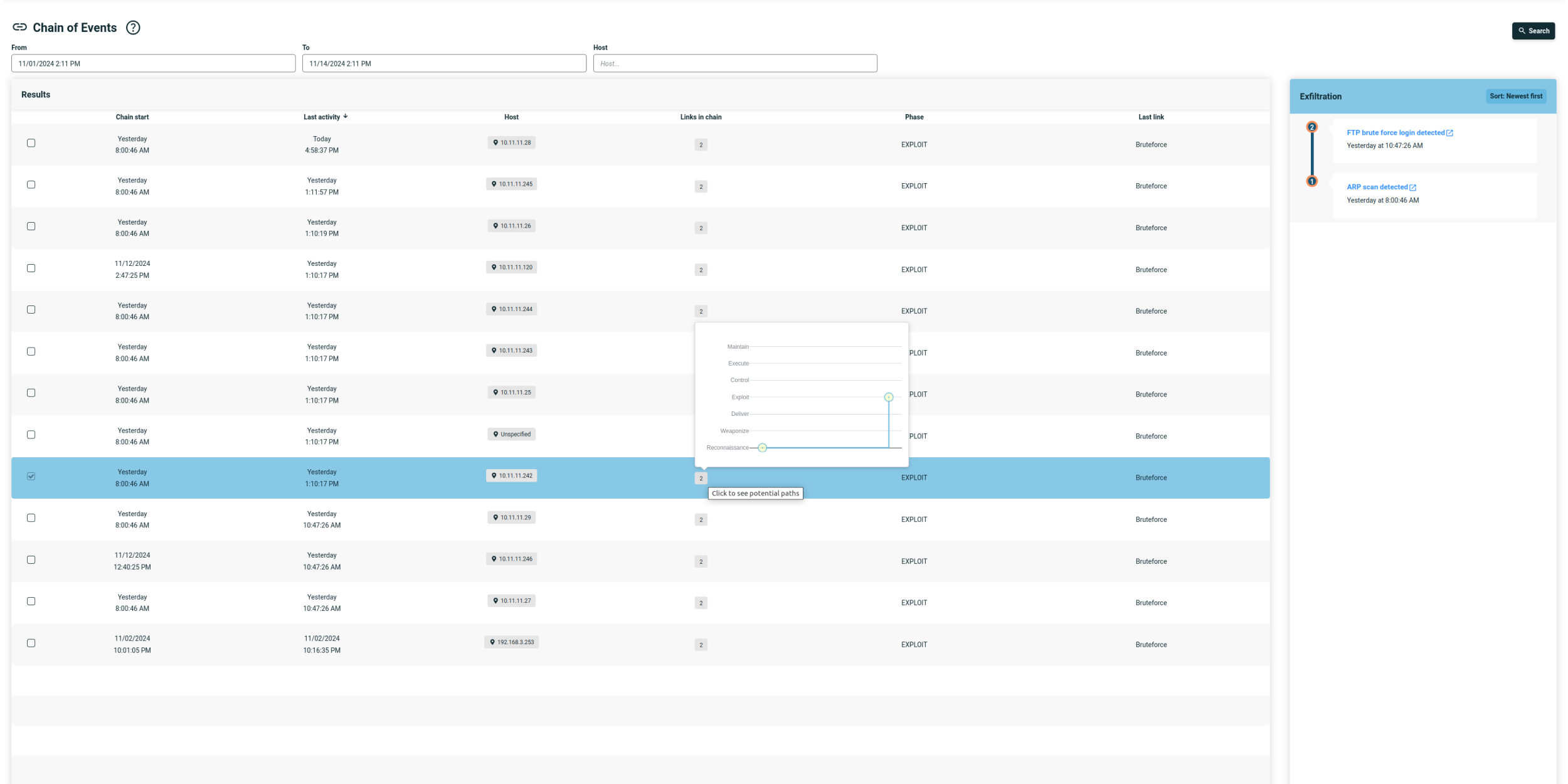 Its easy-to-use widget shows you all the attack patterns at a glance. Munnin will show you the timeline of any chains developed on a device in the network and the possible future paths the chain can take, so you can proactively stop them.