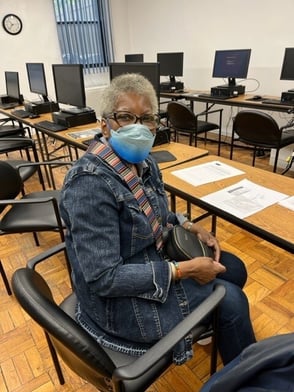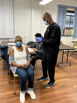 With the Arcturus COVID variant on the move, Project FIND provided its community with the opportunity to keep current on their boosters at its April 19 event held at the Hamilton Older Adult Center from 10:30 am-12:30 pm. Resident Bonetta Howell (top left) explained how she caught COVID early on in the pandemic and needs to keep herself protected from future illness. Hamilton Center participant Margaret Dearlove visited our Coffeehouse Center before the pandemic and as of this fall began attending the Hamilton Center. She loves the arts and crafts activities and manages to attend the Hamilton four times a week traveling all the way from her home in Brooklyn! Wanting to keep current on her COVID vaccines, Margaret was sure to make today's session before lunch and her 1 pm art class. Even Director of Social Work Russell Eisgrub decided to get his booster. Special thanks to Allure Pharmacy's Ronnie Moore and Angelo O'Neill for administering the boosters and supporting our seniors!