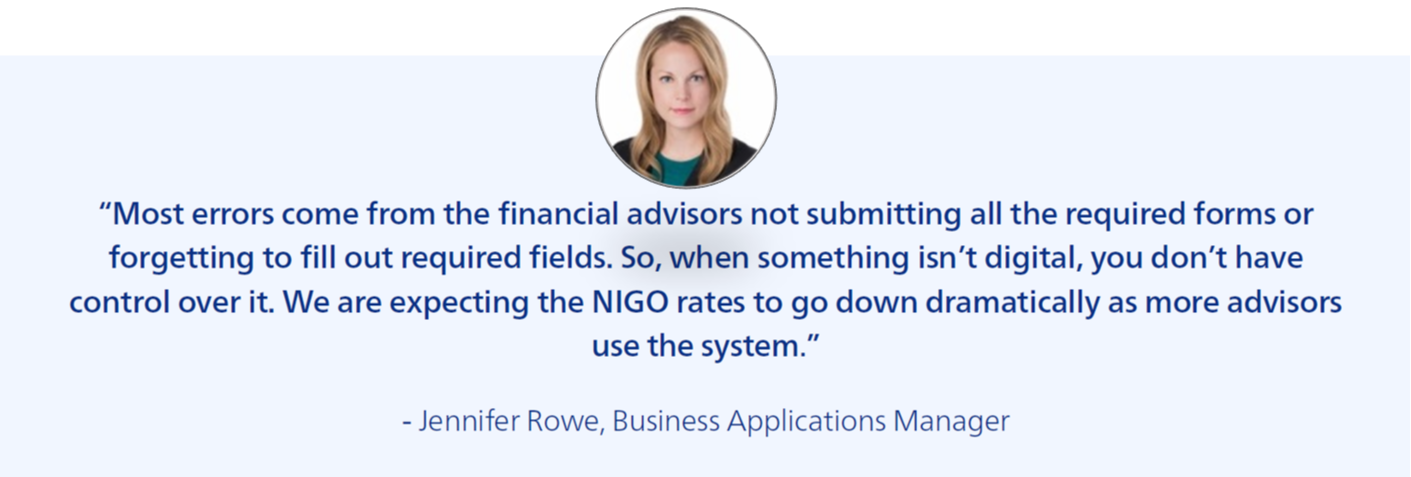 Internally, these new automated digital processes are saving the team hours and enabling the organization to complete requests much quicker. The advisors no longer need to worry about spending time completing tedious forms and worrying about accuracy. And, by eliminating back-and-forth communications over email and postal mail, the data is more secure. New and updated data coming in through SmartIQ has been complete and the team expects NIGO rates to reduce dramatically.